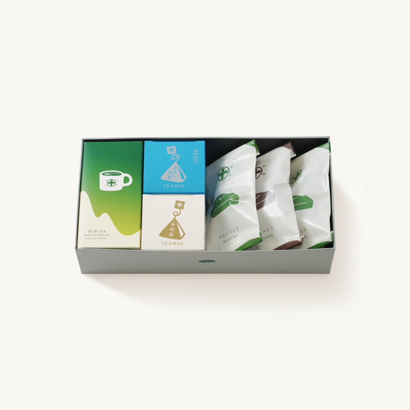 数量限定,ティーバッグキュウブ(水出し煎茶、煎茶、中村茶)と、茶フィーユ1箱(10個入)の詰合せ,空色のBOXでお届け,プチギフトにおすすめ