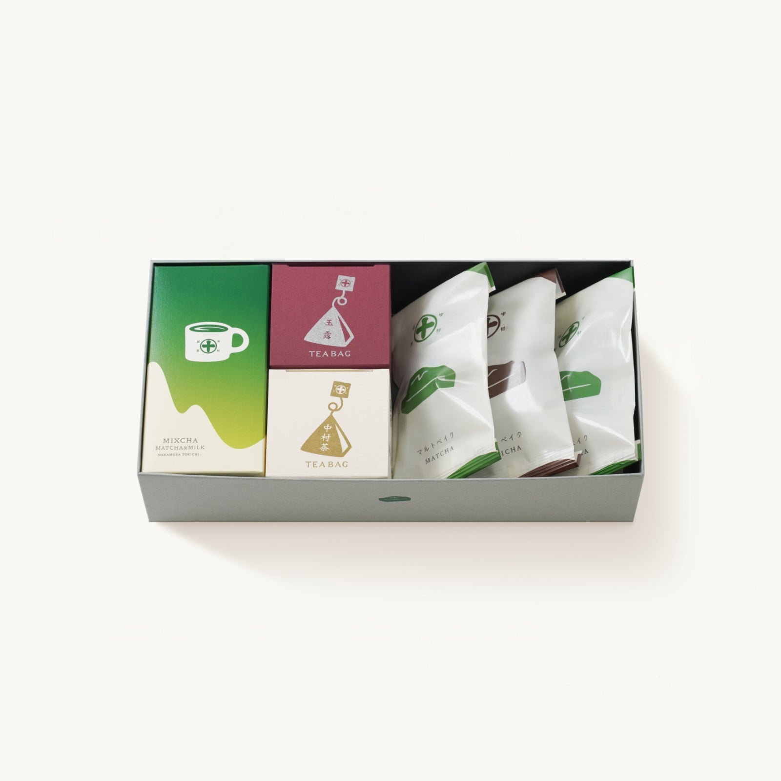 | 内容量 | ミクスチャ[抹茶とミルク]× 1個 マルトベイク[抹茶] × 2個 マルトベイク[ほうじ茶] × 1個 玉露ティーバッグ[キュウブ] × 1個 中村茶ティーバッグ[キュウブ] × 1個 |